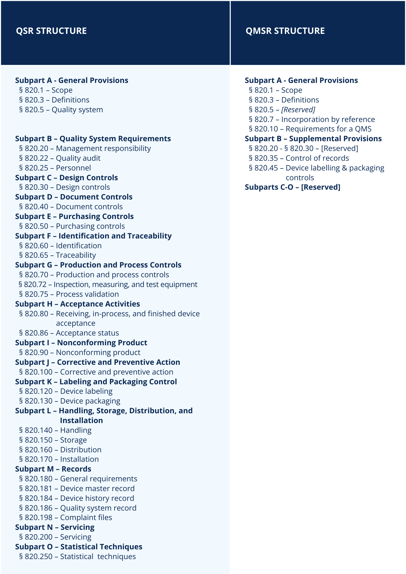 The streamlined structure arises from the high degree of similarity between the QSR requirements and ISO 13485:2016. By incorporating ISO 13485 by reference, the volume of material published in the Code of Federal Regulations (CFR) will be reduced. This reduction is evident when comparing the structures of QSR and QMSR alongside each other, as depicted in the table below.