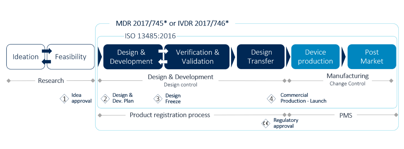 Tenga en cuenta que D&D no termina con la transferencia final de un diseño a la producción. Se sigue aplicando a todos los cambios en el diseño del producto o del proceso de fabricación, incluidos los que se producen mucho después de que el producto se haya introducido en el mercado. El proceso de D&D puede revisarse muchas veces durante la gestión del ciclo de vida del producto, por ejemplo, como resultado de la retroalimentación de la vigilancia post-comercialización.