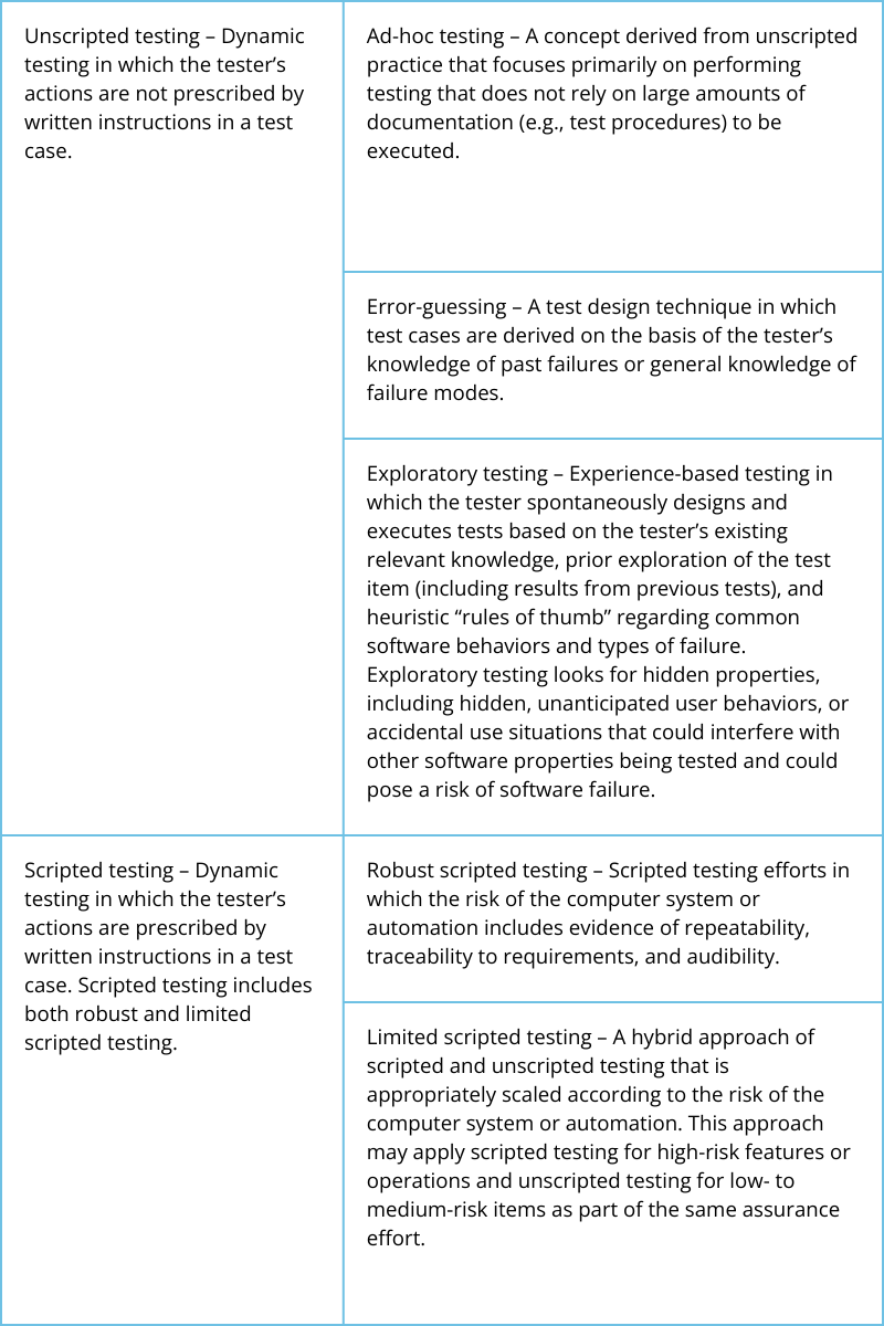 En el caso concreto de los sistemas COT, la mayoría de los proveedores proporcionan su propio paquete de validación. Lo más probable es que la prueba consista en toda la funcionalidad del sistema, por lo que es posible que tenga que filtrar qué prueba es relevante para las funcionalidades utilizadas por su organización. Esto también lo recomienda encarecidamente el enfoque CSA.