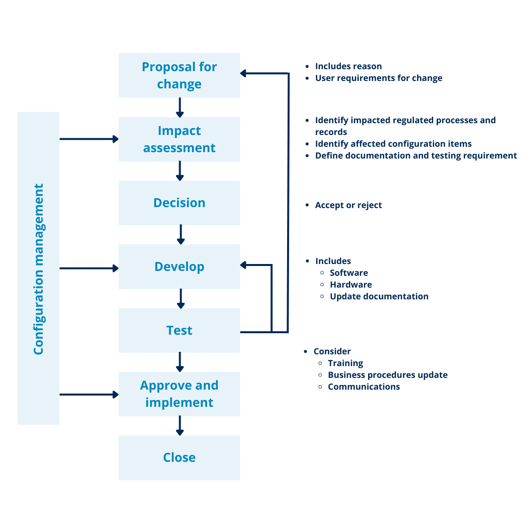 La gestión del control de cambios es una parte esencial de cualquier sistema de garantía de calidad. Nos permite mantener el control del estado validado y estar siempre en conformidad, incluso para los sistemas informáticos más complejos, durante todo su ciclo de vida.