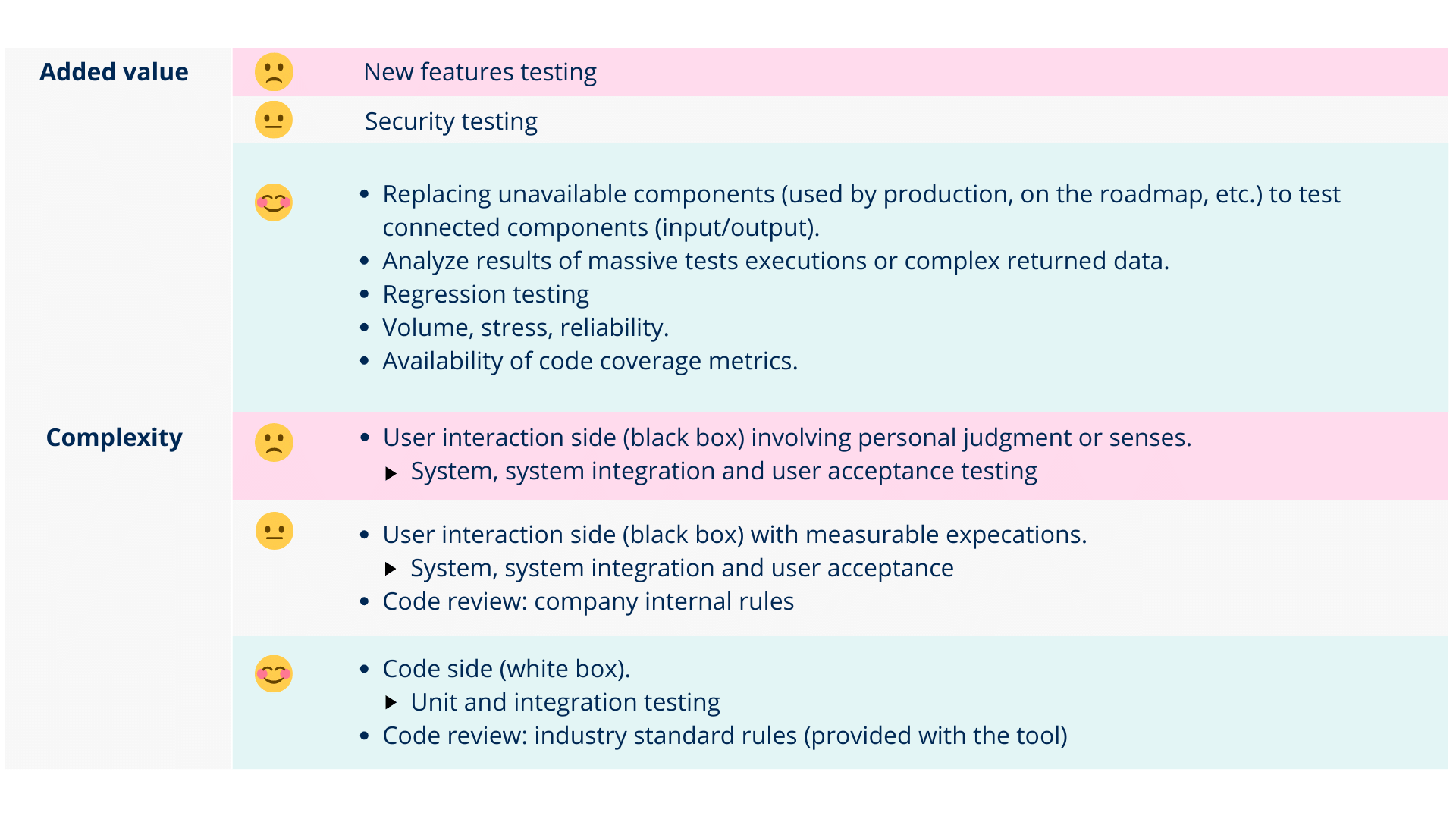 La automatización de pruebas no se limita a practicar la interfaz de usuario final. Tiene muchos aspectos que pueden ayudarle. - Automatice lo que los ordenadores hacen mejor (sistemático, recurrente, etc.) y mantenga las pruebas manuales para lo que los humanos hacen mejor (interacción, visualización, etc.).