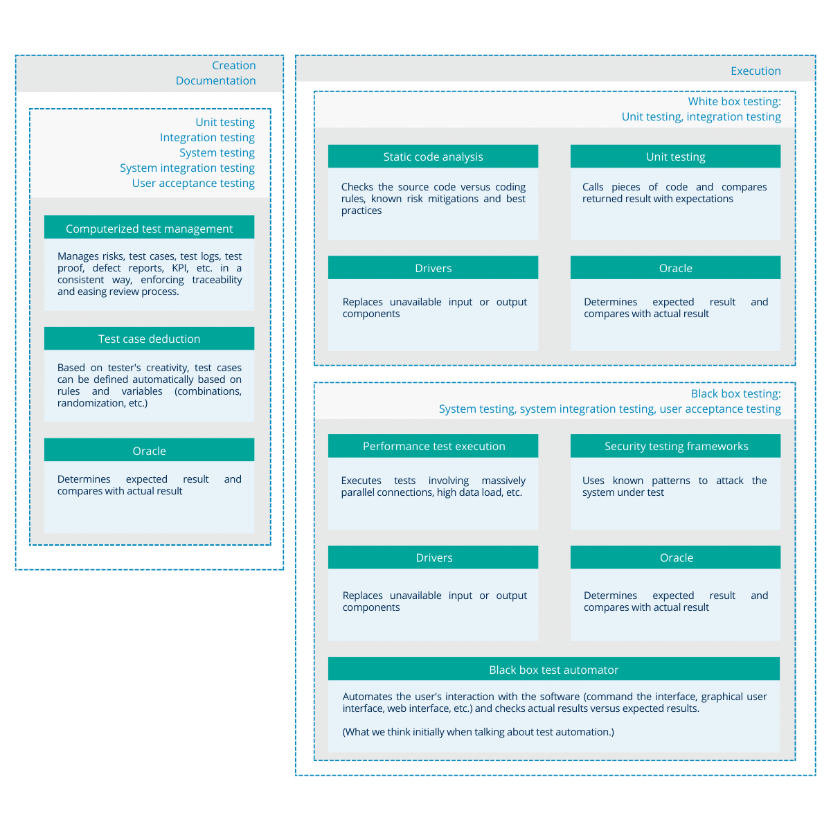 Obsérvese que un controlador puede considerarse caja blanca cuando lo creamos (por ejemplo, llamamos a trozos de código), pero se utiliza la mayoría de las veces en un contexto de caja negra, en el que los probadores no pueden llamar directamente a trozos de código. Por otro lado, los oráculos pueden necesitar desarrollo para su creación, pero como no implican el código del software sometido a prueba, ese desarrollo es una actividad de caja negra.