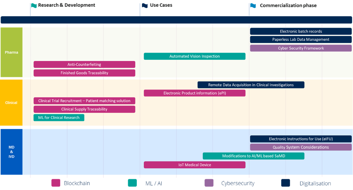 La salud digital en el sector farmacéutico no es solo una tendencia emergente, sino que está dando forma el futuro de la industria farmacéutica. Esta evolución está alterando el panorama de la atención sanitaria y abarca desde los productos farmacéuticos tradicionales hasta la biofarmacia de vanguardia, pasando por los dispositivos médicos y los diagnósticos in vitro. Anteriormente, diseccionamos el ámbito de la salud digital en 3 dominios principales: Pharma, Clinical y MDs/IVDs, e identificamos 4 pilares fundamentales: blockchain, ML/AI, ciberseguridad y digitalización.