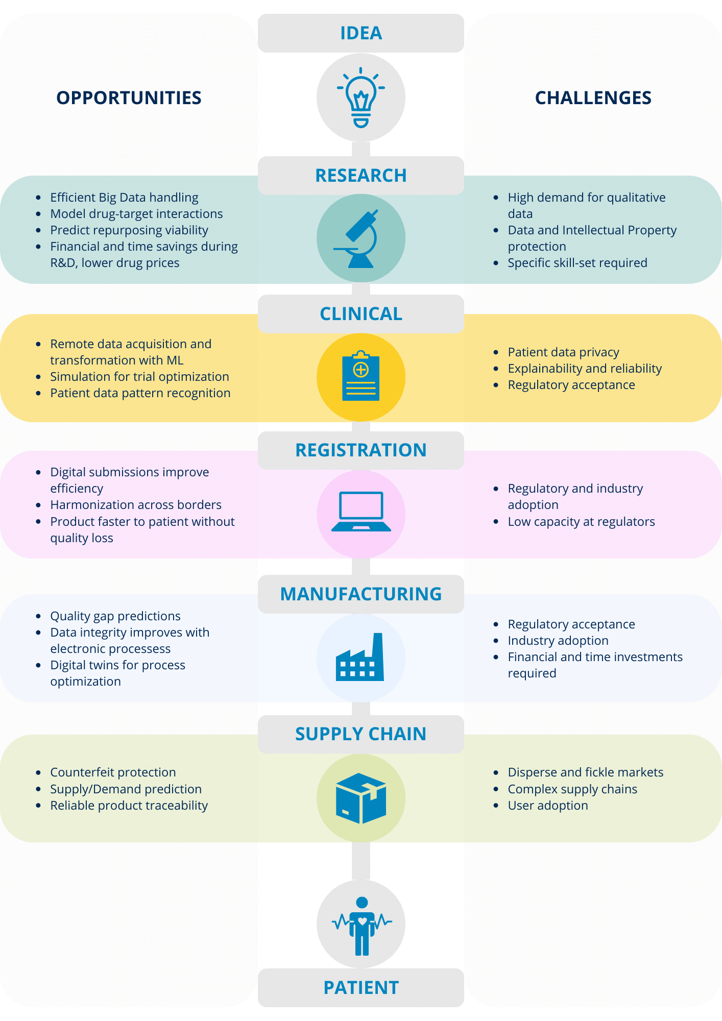 Al optimizar las diferentes etapas del ciclo de vida del producto con tecnologías de salud digital, los nuevos productos pueden llegar hasta el paciente de forma segura, rápida y a un coste menor.